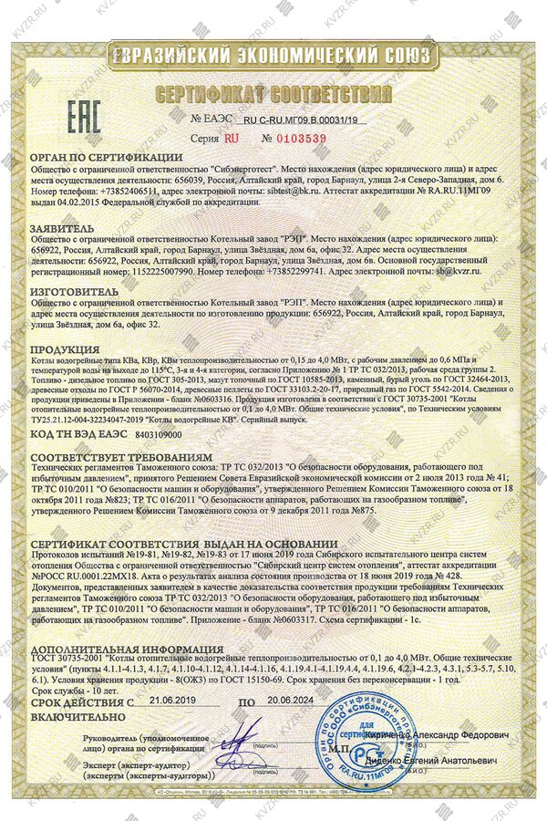 Сертификат на котлы КВ водогрейные соответствует требованиям: